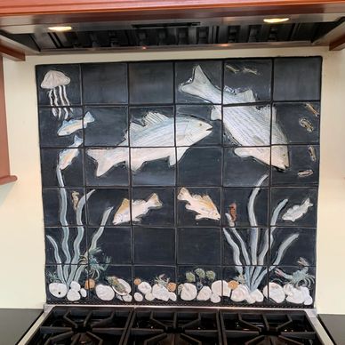 Stoneware tile kitchen backsplash featuring unique Chesapeake Bay aquatic life.